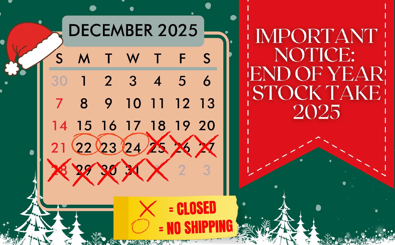 We’re hitting pause on dispatches on the following dates: 22nd December – 24th December 2025. No orders will be shipped during this time. Our last day dispatching orders for the year will be the 19th December. We’re fully closed for the holidays and back to normal on the 2nd January 2026. Feel free to give us a call if you have any questions in this time and someone will be happy to help.