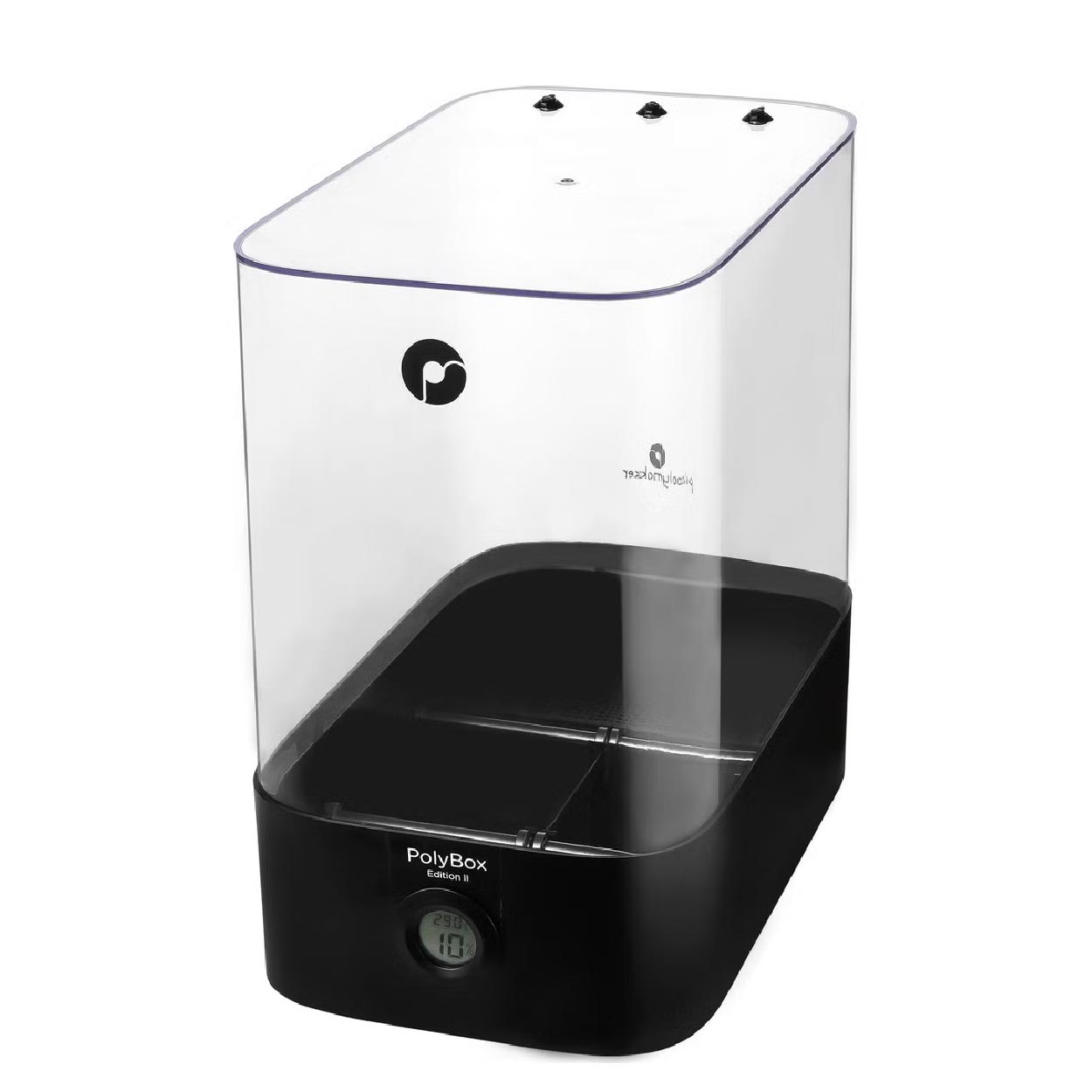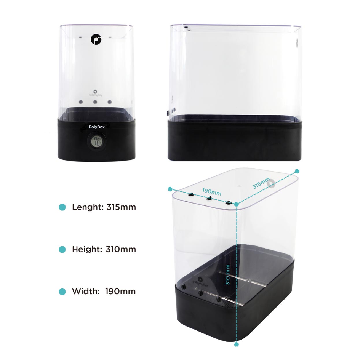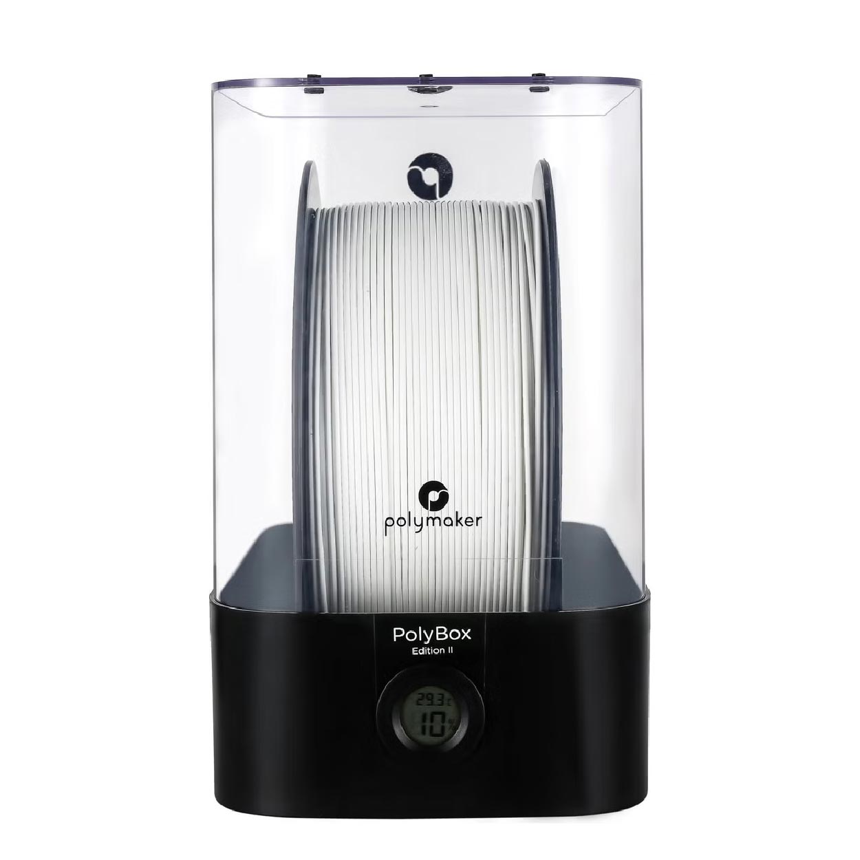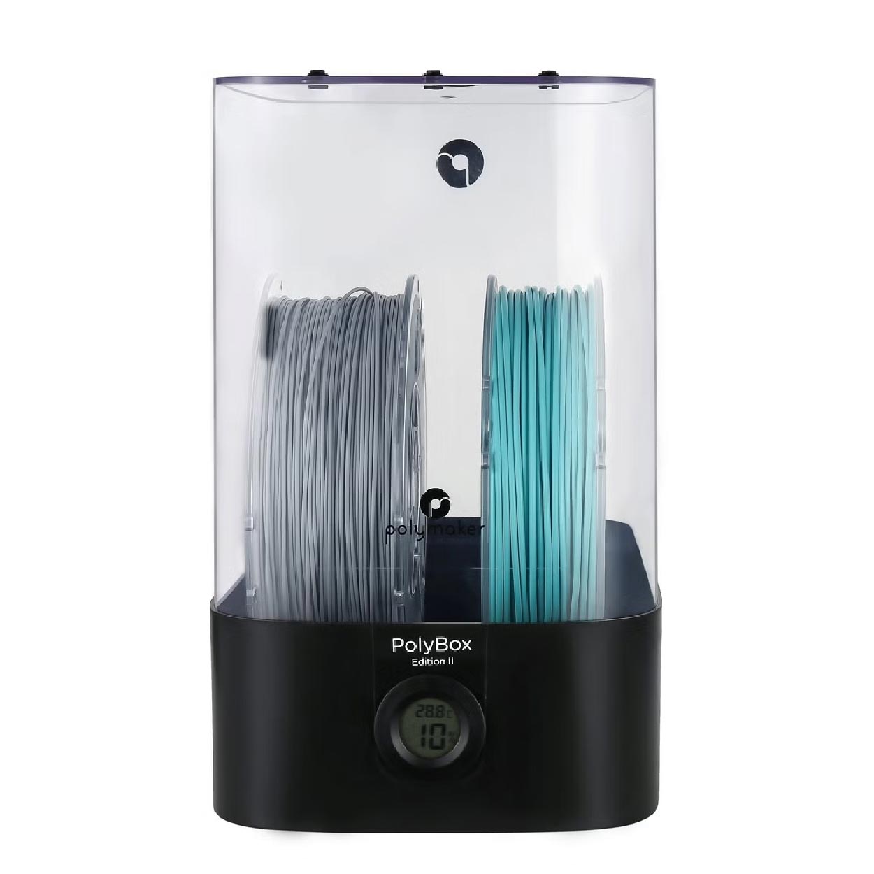 PolyMaker PolyBox Edition 2 is a filament storage box that allows you to store and print your materials in an optimal environment. PolyBox has a thermo-hygrometer to monitor the filaments in the box. The humidity is regulated by large desiccant bags. This product is designed for hygroscopic materials such as PolySmooth (PVB), PVA or nylon.