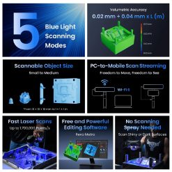 The Revopoint MetroY Pro is the next generation of professional 3D scanners! With no less than five powerful scanning modes, it combines the precision of blue laser technology with the flexibility of structured light. It captures even the most complex geometries, shiny or dark surfaces and the finest details with impressive speed and accuracy – wirelessly, efficiently and ready to use at any time!